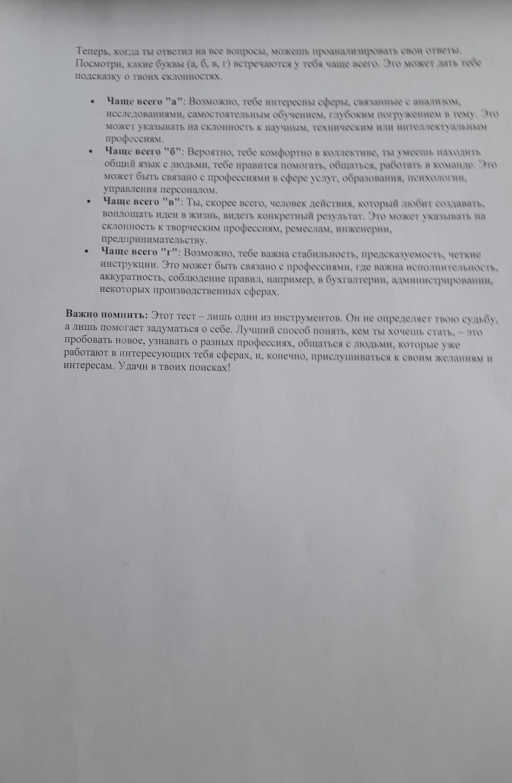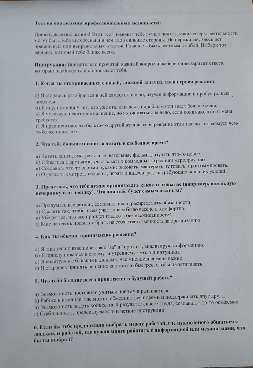 23 желтоқсан күні біздің оныншы сынып оқушылары мансапқа бейімділік тестінен өтті. Мақсаты: оқушыларға болашақ мамандығын саналы түрде таңдауға мүмкіндік беру үшін өздерінің қызығушылықтары мен қабілеттерін жақсы түсінуге көмектесу. Бұл жай ғана тест емес, өзін, күшті жақтарын және одан әрі білім алу мен мансап үшін әлеуетті салаларын жақсырақ түсіну мүмкіндігі. Тестті аяқтағаннан кейін қатысушыларға нәтижелері көрсетіліп, қандай мамандықтар оларға сәйкес келуі мүмкін екендігі, сондай-ақ қандай дағдыларды дамыту керектігі түсіндірілді. Болашағыңызды қазір ойластырып, саналы таңдау жасау өте маңызды.