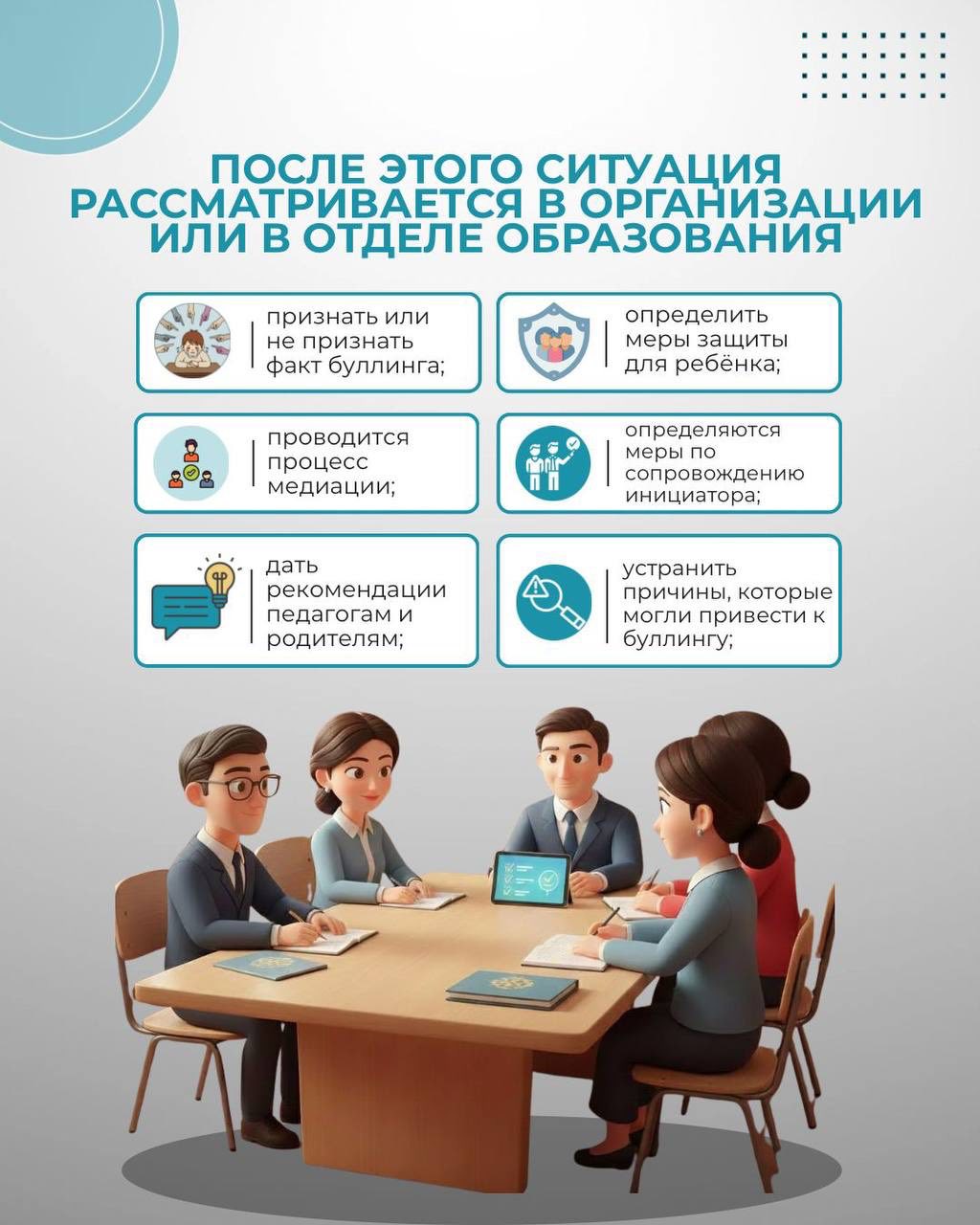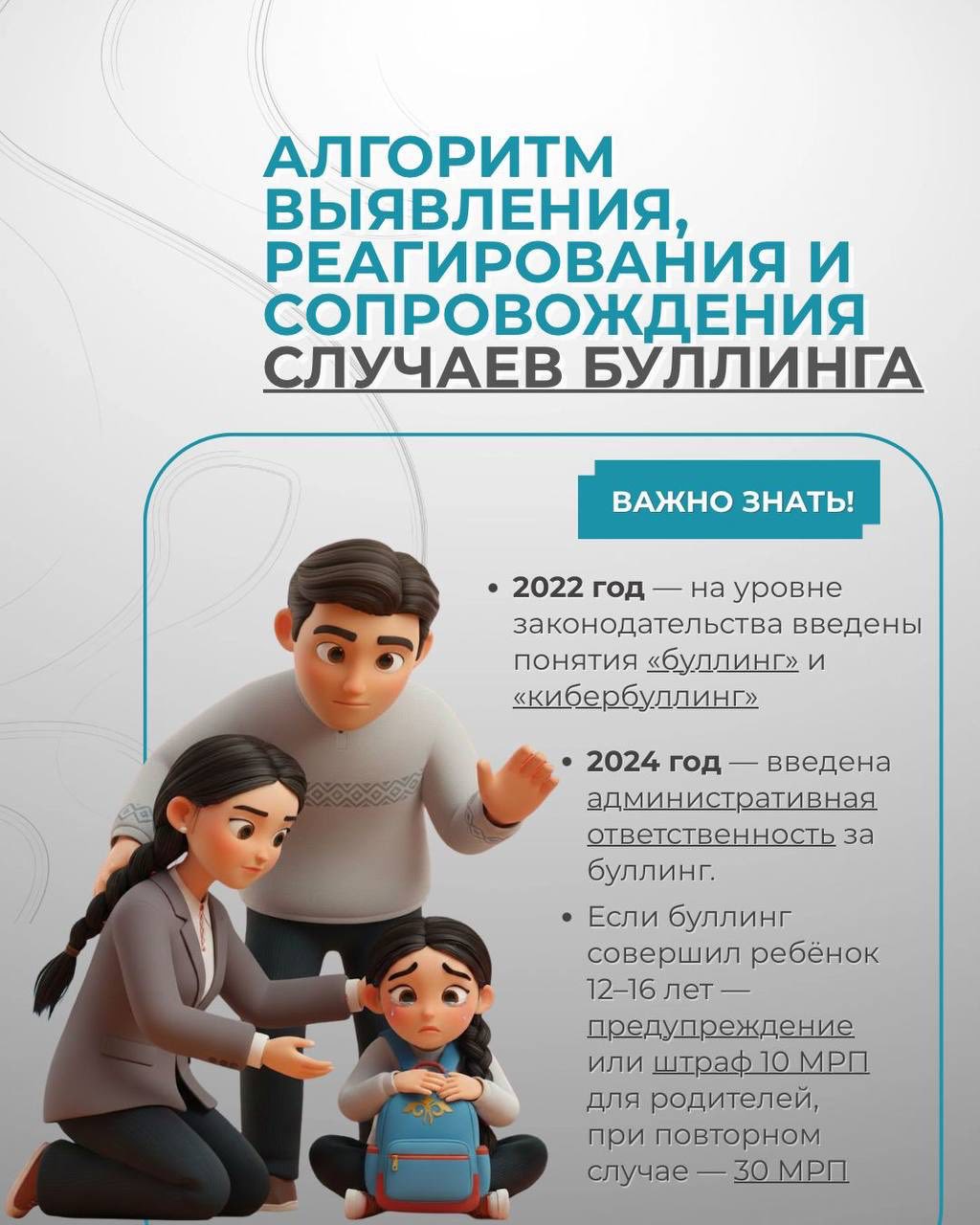 Қорқытуды уақтылы анықтау және жылдам жауап беру — оның алдын алудың ең тиімді жолы 2022 жылдан бастап Қазақстанда "буллинг" және "кибербуллинг"ұғымдары заңнамалық деңгейде бекітілді. 2024 жылдан бастап мұндай әрекеттер үшін әкімшілік жауапкершілік қарастырылған. Ағымдағы жылдың 11 айында 404 іс тіркелді, оның ішінде 238 адам жауапқа тартылды. Жоғарыда келтірілген инфографикада ата-аналарға, мұғалімдерге және мамандарға арналған іс-қимыл алгоритмі, құқықтық шаралар және нақты ұсыныстар берілген.