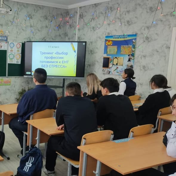 12.01.2026 года в школе проведён тренинг для учащихся 11 классов на тему «Твой компас в мире профессий: готовимся к ЕНТ без стресса». Как педагог-психолог и педагог-профориентатор, мы объединили свои усилия, чтобы помочь ребятам научиться справляться с волнением и стрессом перед важным экзаменом. Цель: поддержать старшеклассников в период выбора жизненного пути и подготовки к ЕНТ, дать им практические инструменты для управления эмоциями и уверенного взгляда в будущее. Мы уверены, что правильная профориентация и психологическая подготовка- ключ к успешной сдаче ЕНТ и осознанному выбору профессии.
